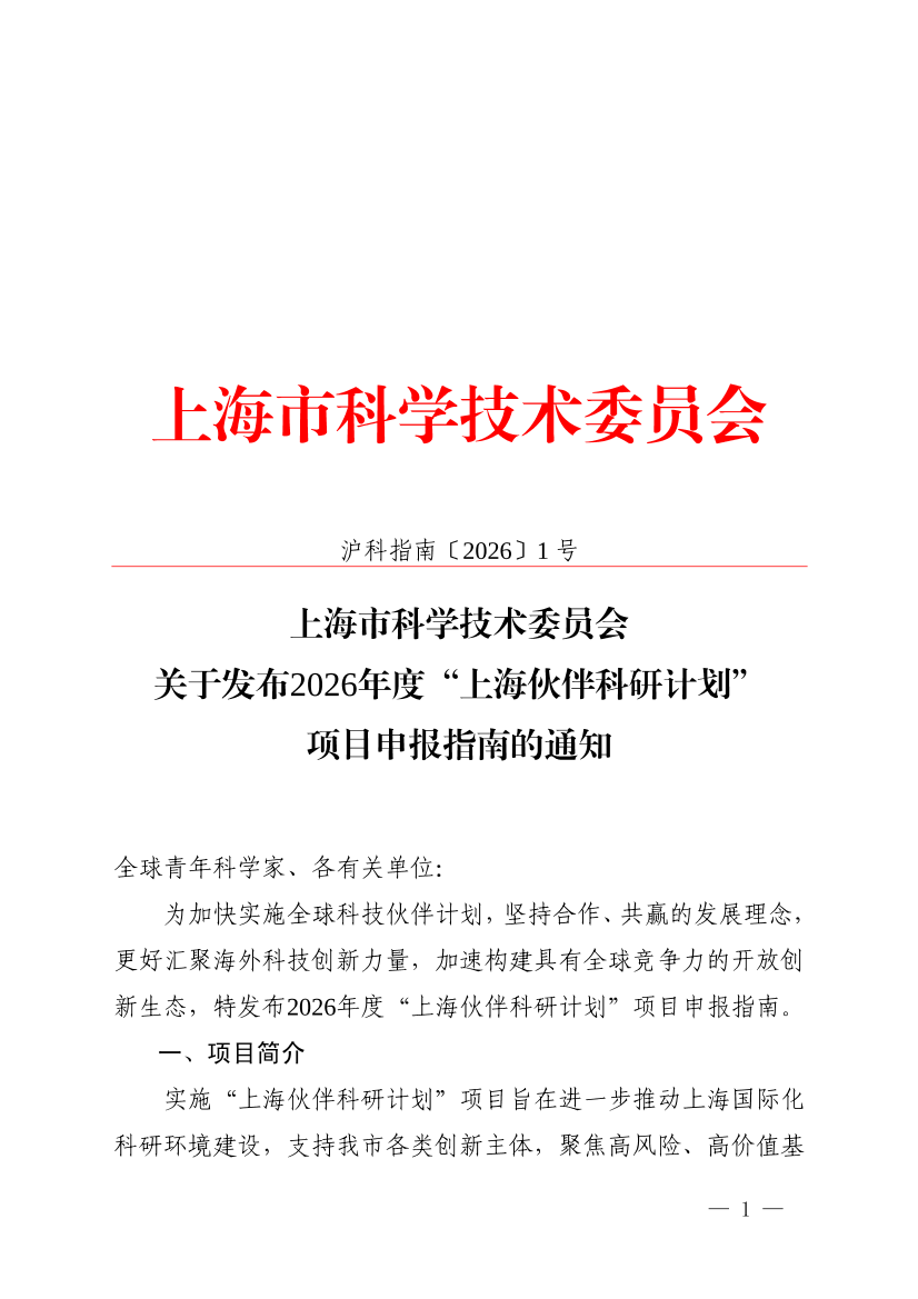 为加快实施全球科技伙伴计划,坚持合作、共赢的发展理念,更好汇聚海外科技创新力量,加速构建具有全球竞争力的开放创新生态,特发布2026年度“上海伙伴科研计划”项目申报指南。
