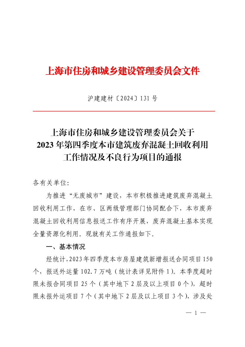 关于2023年第四季度本市建筑废弃混凝土回收利用工作情况及不良行为项目的通报