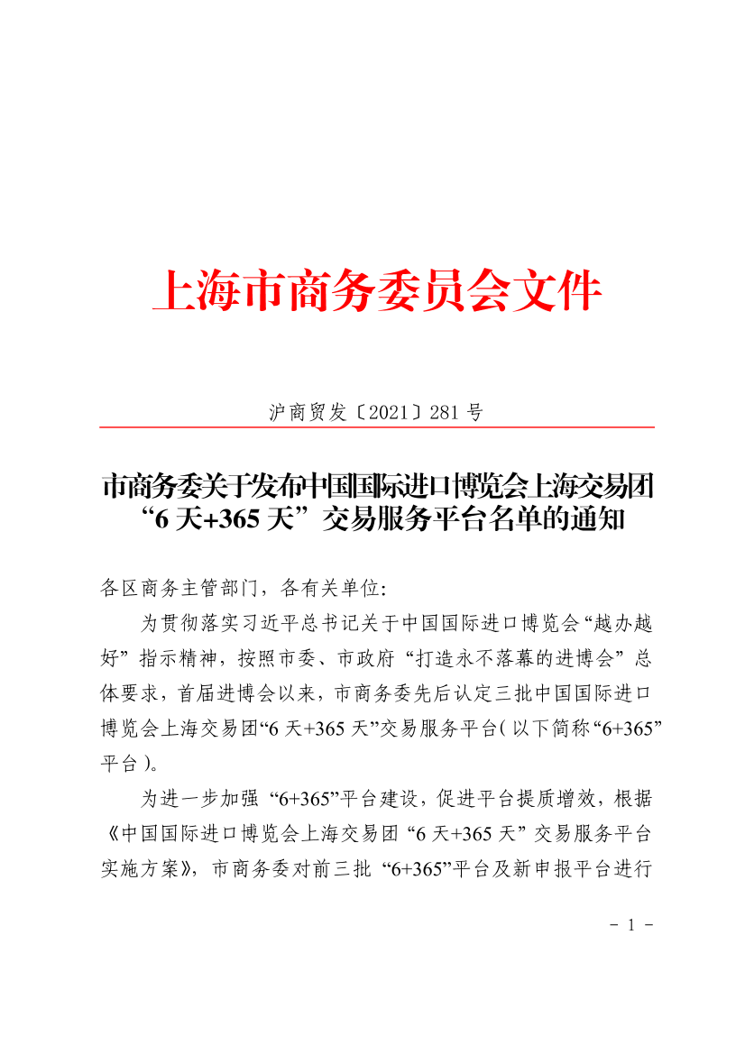 为进一步加强 “6+365”平台建设,促进平台提质增效,根据《中国国际进口博览会上海交易团“6天+365天”交易服务平台实施方案》,市商务委对前三批 “6+365”平台及新申报平台进行了专家评审和动态调整,最终认定中国国际进口博览会上海交易团“6天+365天”交易服务平台60家。