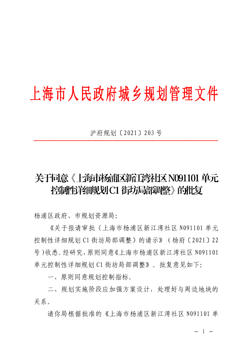 《关于报请审批〈上海市杨浦区新江湾社区N091101单元控制性详细规划C1街坊局部调整〉的请示》(杨府〔2021〕22号)收悉。经研究,原则同意《上海市杨浦区新江湾社区N091101单元控制性详细规划C1街坊局部调整》。批复意见如下: