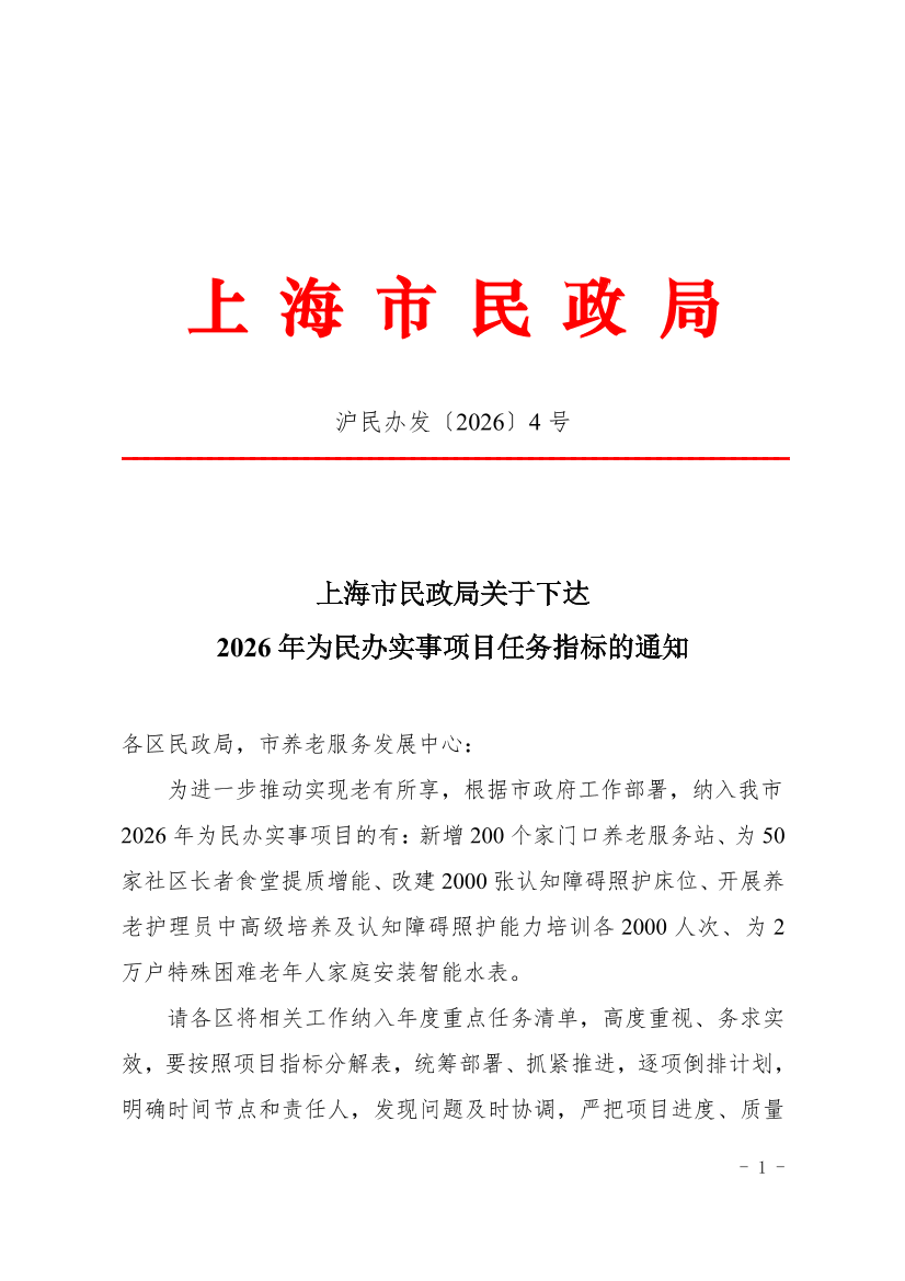 为进一步推动实现老有所享,根据市政府工作部署,纳入我市2026年为民办实事项目的有:新增200个家门口养老服务站、为50家社区长者食堂提质增能、改建2000张认知障碍照护床位、开展养老护理员中高级培养及认知障碍照护能力培训各2000人次、为2万户特殊困难老年人家庭安装智能水表。