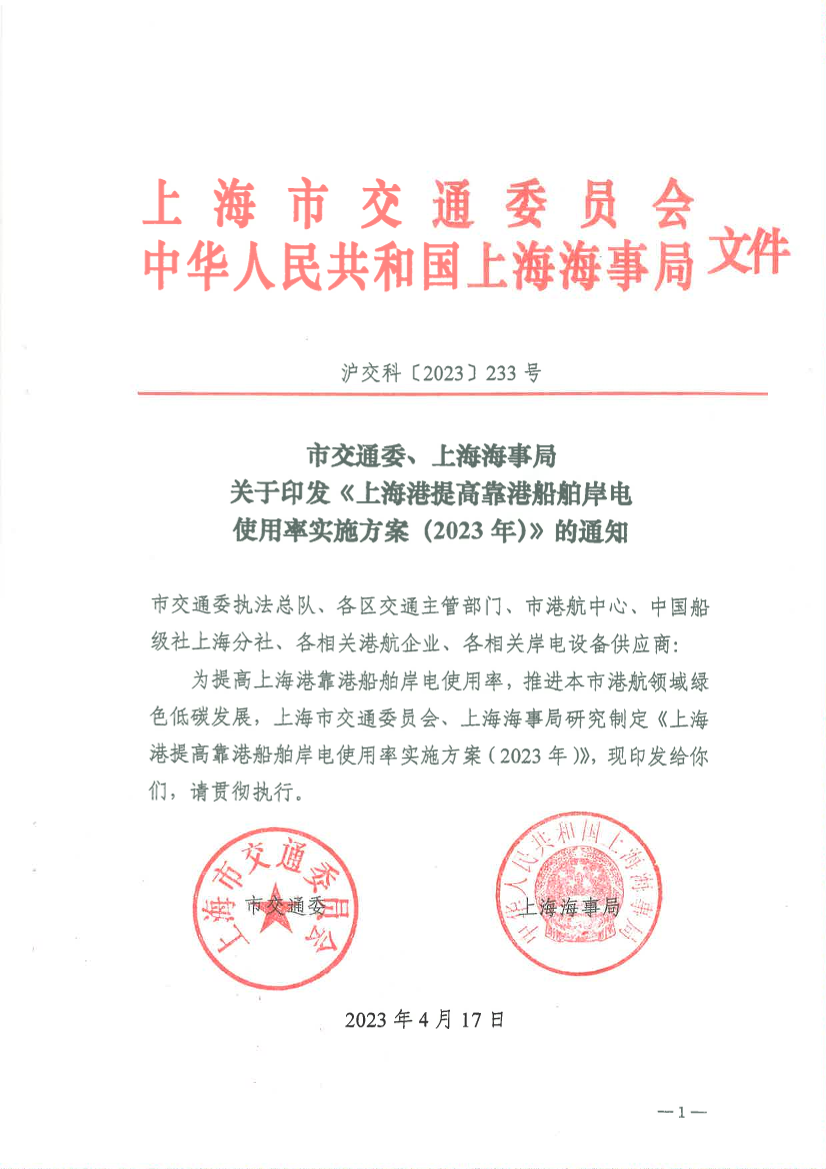 为提高上海港靠港船舶岸电使用率,推进本市港航领域绿色低碳发展,上海市交通委员会、上海海事局研究制定《上海港提高靠港船舶岸电使用率实施方案(2023年)》,现印发给你们,请贯彻执行。