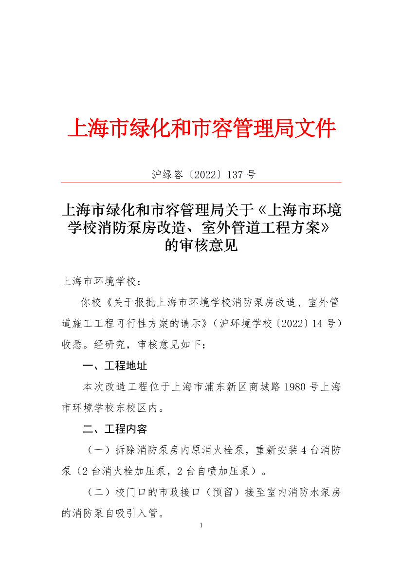 你校《关于报批上海市环境学校消防泵房改造、室外管道施工工程可行性方案的请示》(沪环境学校〔2022〕14号)收悉。经研究,审核意见如下: