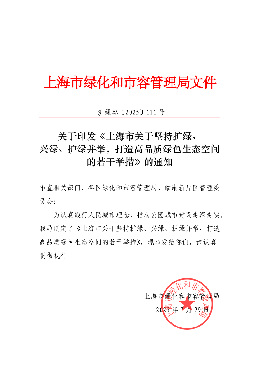 为认真践行人民城市理念,推动公园城市建设走深走实,我局制定了《上海市关于坚持扩绿、兴绿、护绿并举,打造高品质绿色生态空间的若干举措》,现印发给你们,请认真贯彻执行。