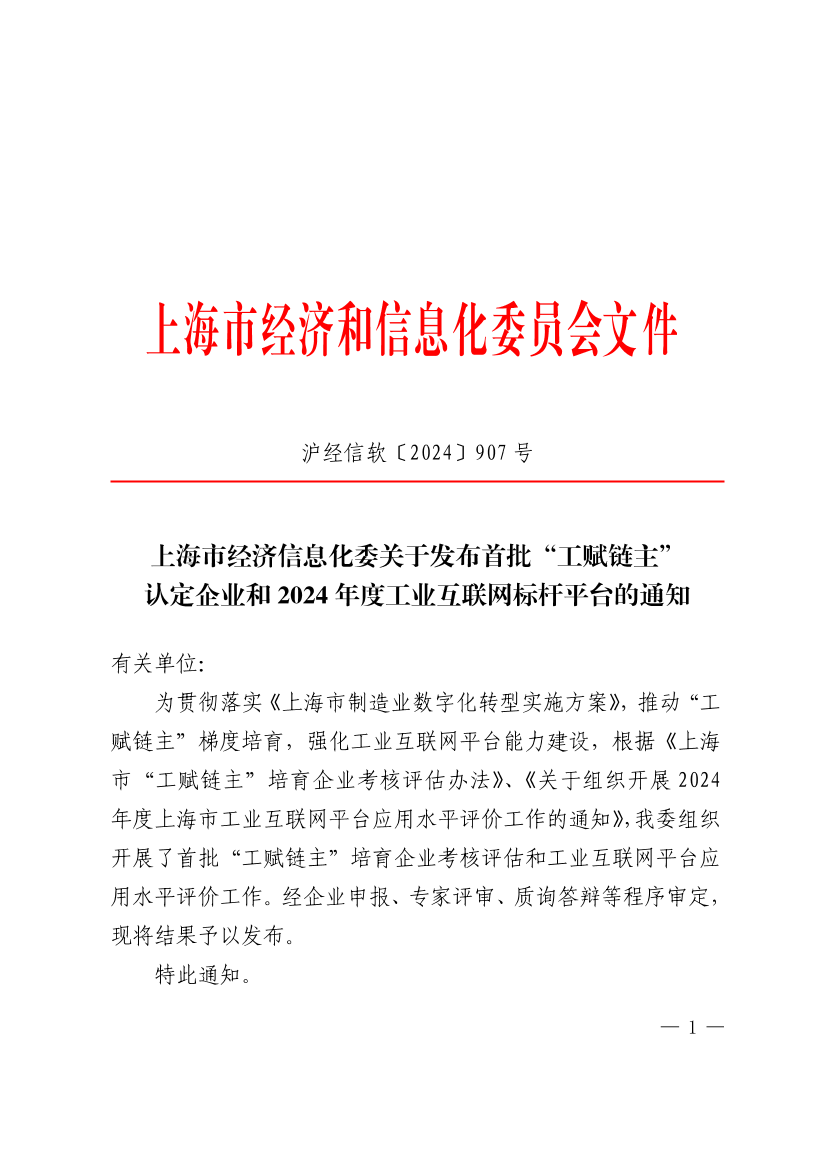 为贯彻落实《上海市制造业数字化转型实施方案》,推动“工赋链主”梯度培育,强化工业互联网平台能力建设,根据《上海市“工赋链主”培育企业考核评估办法》、《关于组织开展2024年度上海市工业互联网平台应用水平评价工作的通知》,我委组织开展了首批“工赋链主”培育企业考核评估和工业互联网平台应用水平评价工作。经企业申报、专家评审、质询答辩等程序审定,现将结果予以发布。