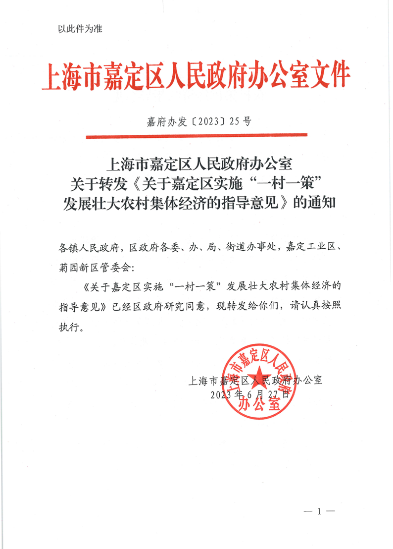 《关于嘉定区实施“一村一策”发展壮大农村集体经济的指导意见》已经区政府研究同意,现转发给你们,请认真按照执行。