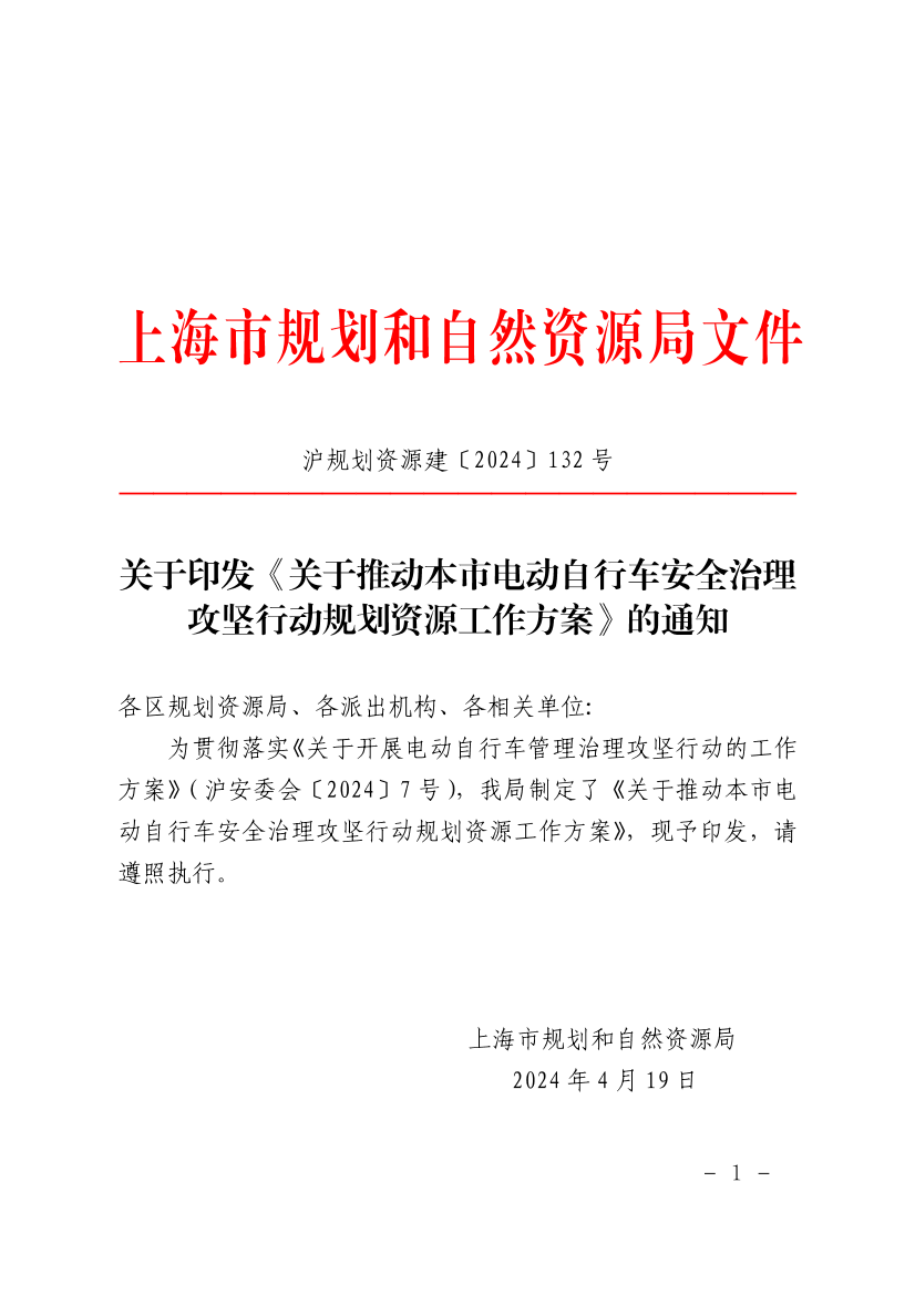 为贯彻落实《关于开展电动自行车管理治理攻坚行动的工作方案》(沪安委会〔2024〕7号),我局制定了《关于推动本市电动自行车安全治理攻坚行动规划资源工作方案》,现予印发,请遵照执行。