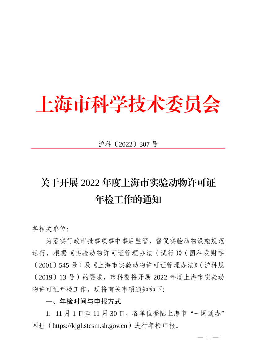 为落实行政审批事项事中事后监管,督促实验动物设施规范运行,根据《实验动物许可证管理办法(试行)》(国科发财字〔2001〕545号)及《上海市实验动物许可证管理办法》(沪科规〔2019〕13号)的要求,市科委将开展2022年度上海市实验动物许可证年检工作,现将有关事项通知如下:
