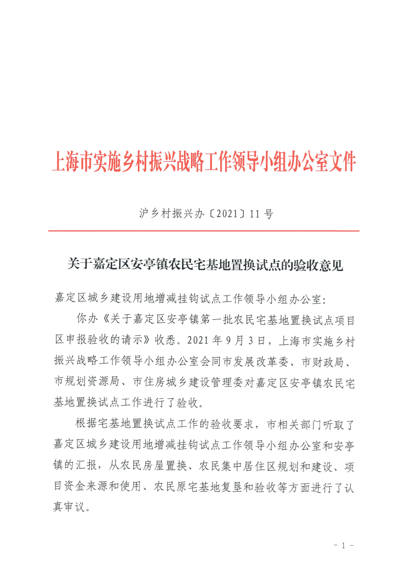 你办《关于嘉定区安亭镇第一批农民宅基地置换试点项目区申报验收的请示》收悉。2021年9月3日,上海市实施乡村振兴战略工作领导小组办公室会同市发展改革委、市财政局、市规划资源局、市住房城乡建设管理委对嘉定区安亭镇农民宅基地置换试点工作进行了验收。