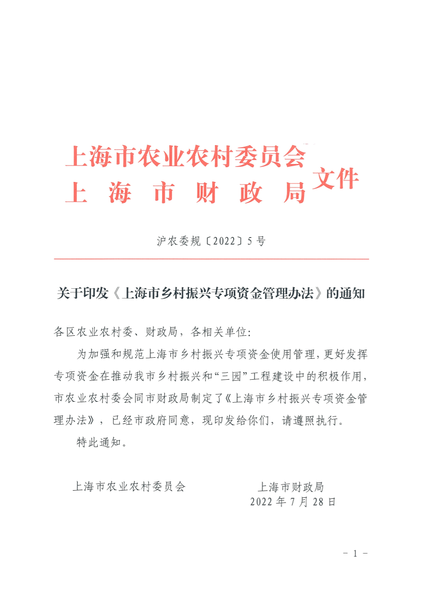 为加强和规范上海市乡村振兴专项资金使用管理,更好发挥专项资金在推动我市乡村振兴和“三园”工程建设中的积极作用,市农业农村委会同市财政局制定了《上海市乡村振兴专项资金管理办法》,已经市政府同意,现印发给你们,请遵照执行。
