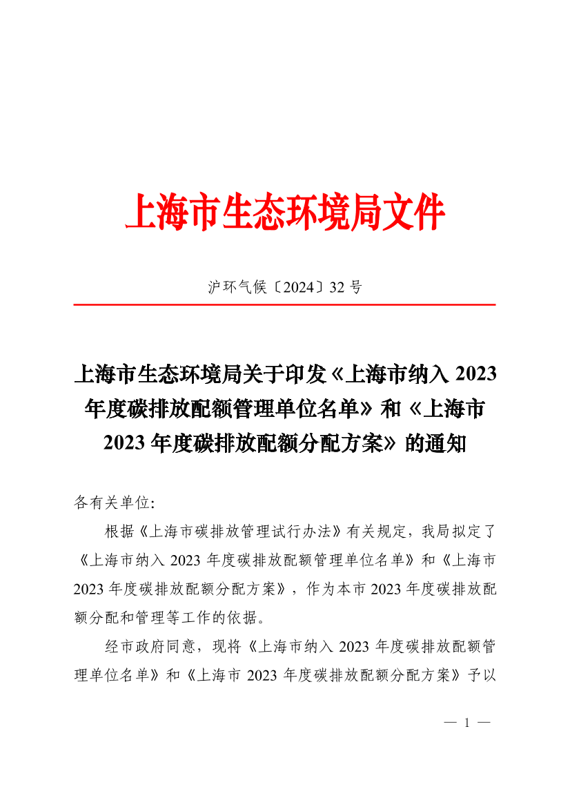 根据《上海市碳排放管理试行办法》有关规定,我局拟定了《上海市纳入2023年度碳排放配额管理单位名单》和《上海市2023年度碳排放配额分配方案》,作为本市2023年度碳排放配额分配和管理等工作的依据。