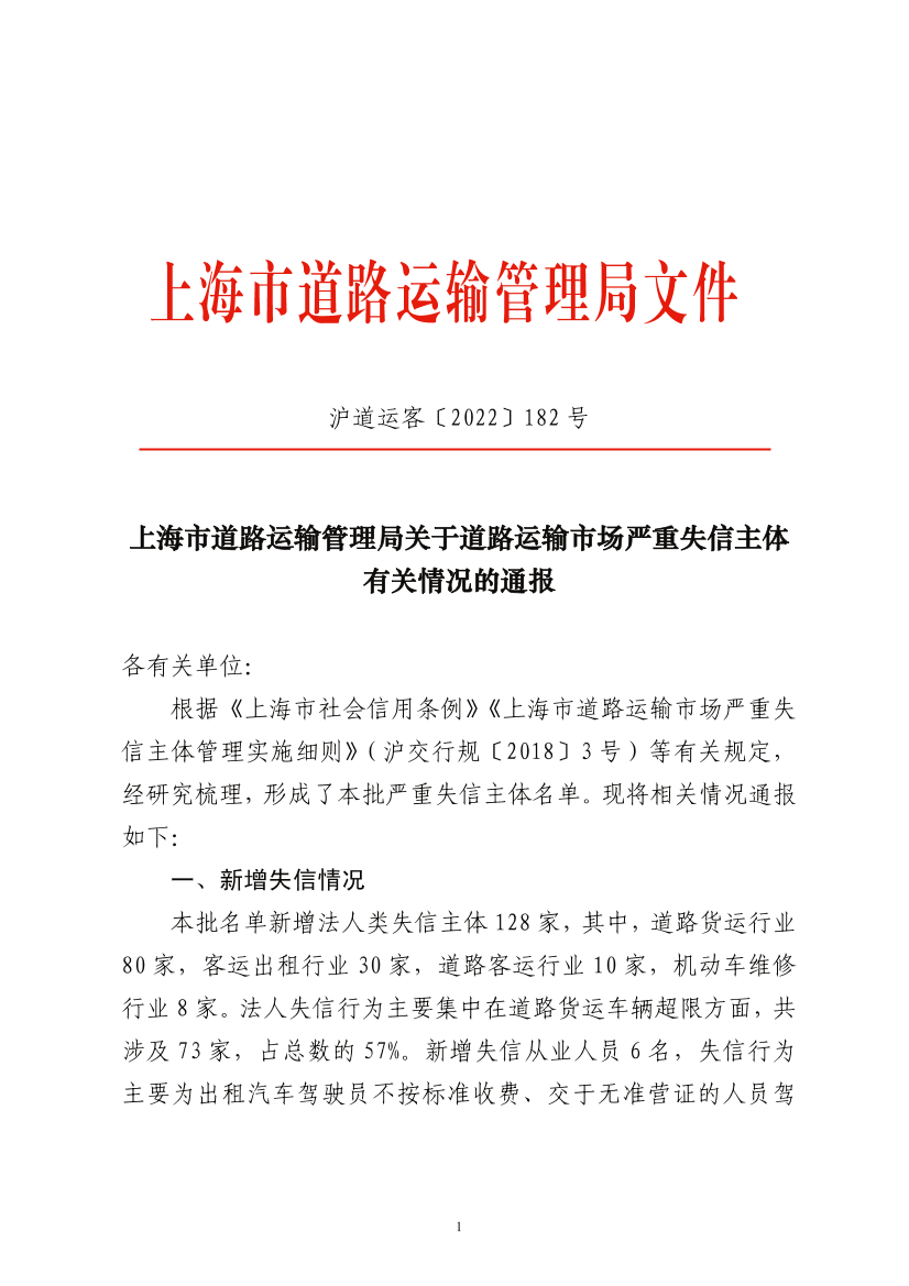 根据《上海市社会信用条例》《上海市道路运输市场严重失信主体管理实施细则》(沪交行规〔2018〕3号)等有关规定,经研究梳理,形成了本批严重失信主体名单。现将相关情况通报如下: