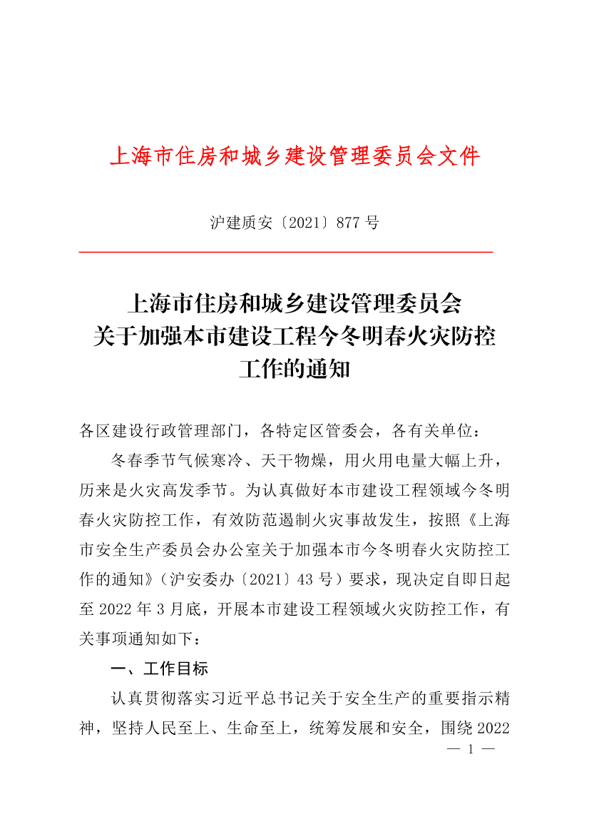 冬春季节气候寒冷、天干物燥,用火用电量大幅上升,历来是火灾高发季节。为认真做好本市建设工程领域今冬明春火灾防控工作,有效防范遏制火灾事故发生,按照《上海市安全生产委员会办公室关于加强本市今冬明春火灾防控工作的通知》(沪安委办〔2021〕43 号)要求,现决定自即日起 至 2022 年 3 月底,开展本市建设工程领域火灾防控工作,有关事项通知如下: