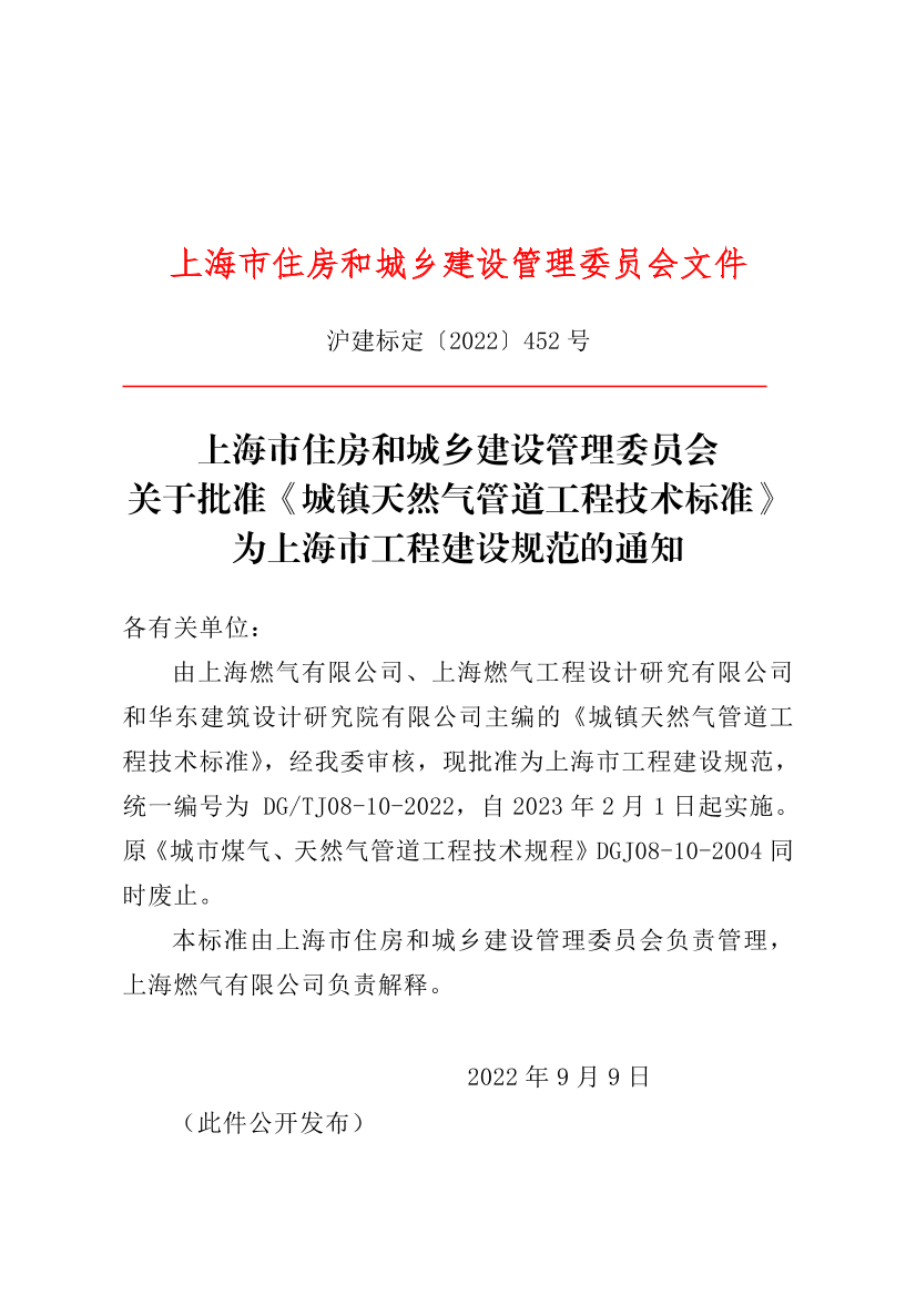 由上海燃气有限公司、上海燃气工程设计研究有限公司和华东建筑设计研究院有限公司主编的《城镇天然气管道工程技术标准》,经我委审核,现批准为上海市工程建设规范,统一编号为 DG/TJ08-10-2022,自2023年2月1日起实施。原《城市煤气、天然气管道工程技术规程》DGJ08-10-2004同时废止。