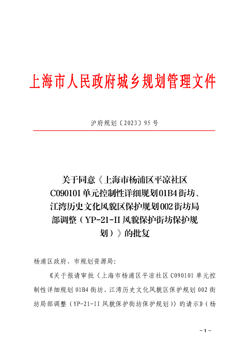 《关于报请审批〈上海市杨浦区平凉社区C090101单元控制性详细规划01B4街坊、江湾历史文化风貌区保护规划002街坊局部调整(YP-21-II风貌保护街坊保护规划)〉的请示》(杨府〔2023〕4号)收悉。经研究,原则同意上报规划内容。