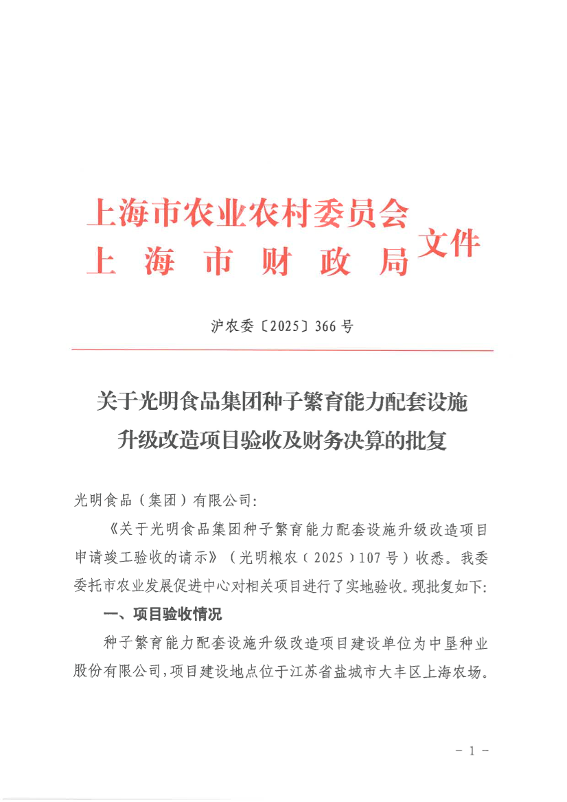 《关于光明食品集团种子繁育能力配套设施升级改造项目申请竣工验收的请示》(光明粮农﹝2025﹞107号)收悉。我委委托市农业发展促进中心对相关项目进行了实地验收。现批复如下: