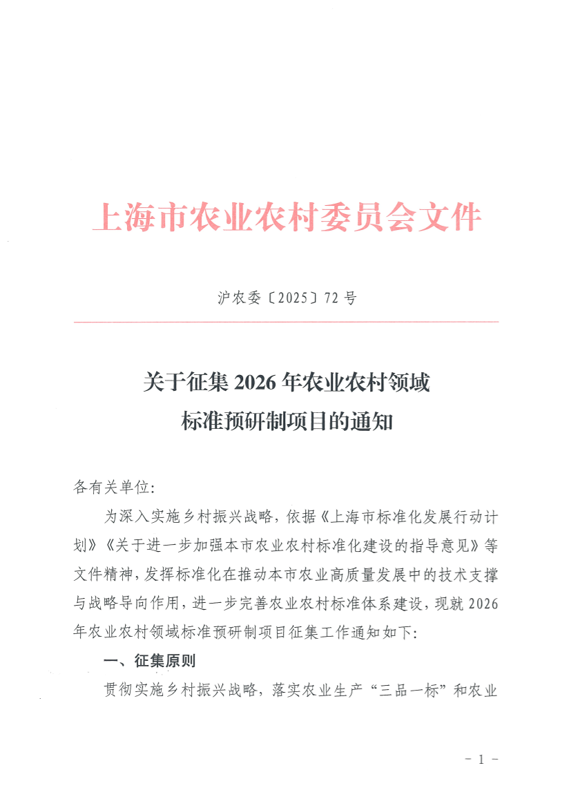 为深入实施乡村振兴战略,依据《上海市标准化发展行动计划》《关于进一步加强本市农业农村标准化建设的指导意见》等文件精神,发挥标准化在推动本市农业高质量发展中的技术支撑与战略导向作用,进一步完善农业农村标准体系建设,现就2026年农业农村领域标准预研制项目征集工作通知如下: