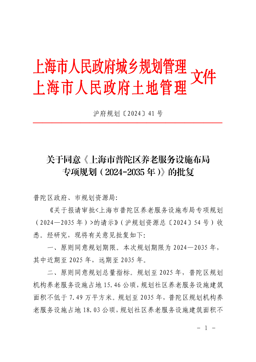 关于同意《上海市普陀区养老服务设施布局专项规划(2024-2035年)》的批复