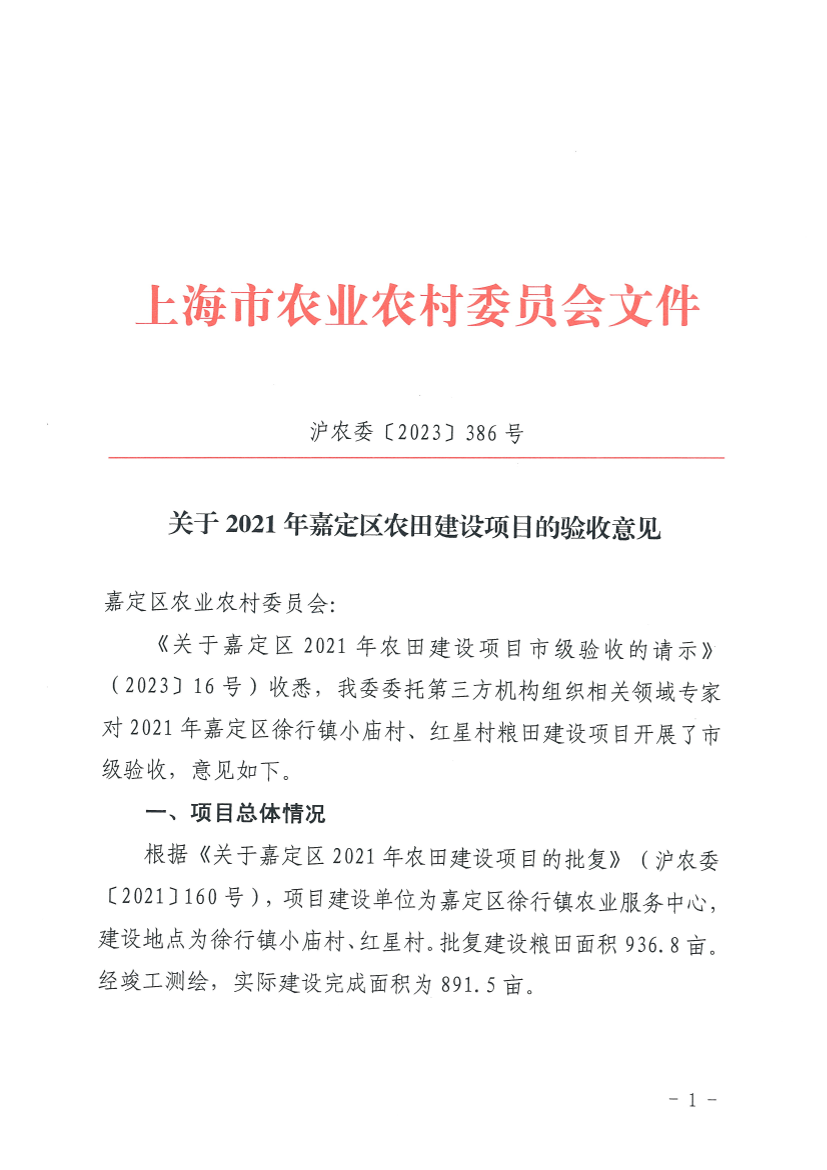 《关于嘉定区2021年农田建设项目市级验收的请示》(2023〕16号)收悉,我委委托第三方机构组织相关领域专家对2021年嘉定区徐行镇小庙村、红星村粮田建设项目开展了市级验收,意见如下。