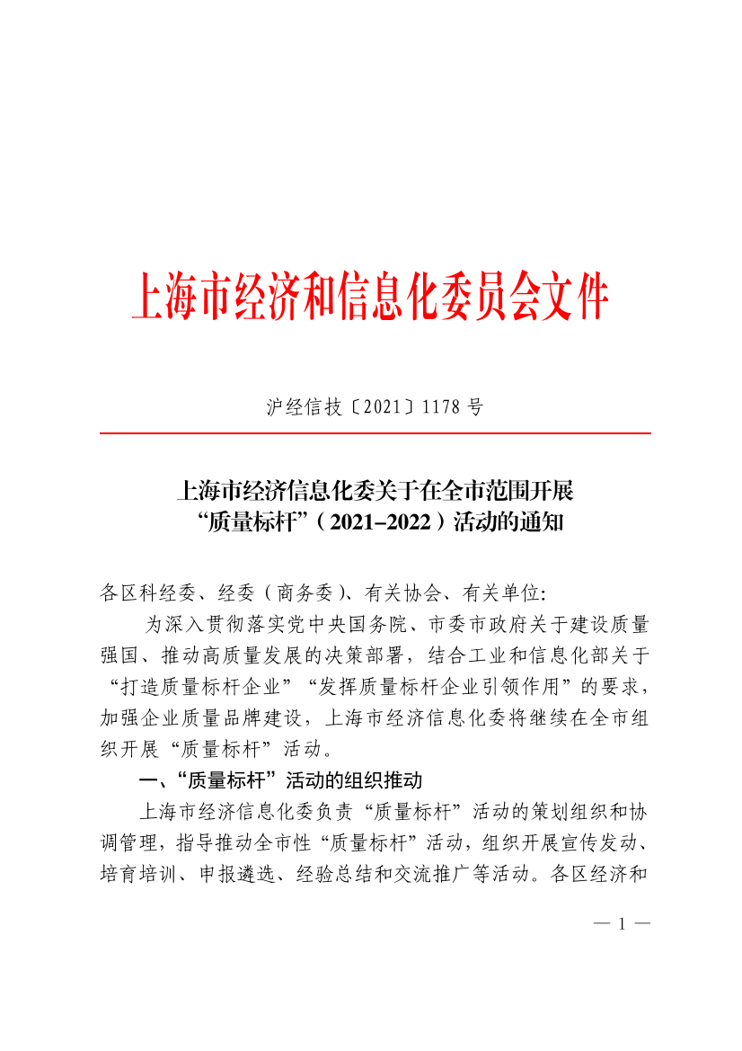 根据工业和信息化部、中国质量协会2022年度全国“质量标杆”的申报推荐要求,上海市经济信息化委在上海市质量标杆遴选基础上,组织推荐全国“质量标杆”。