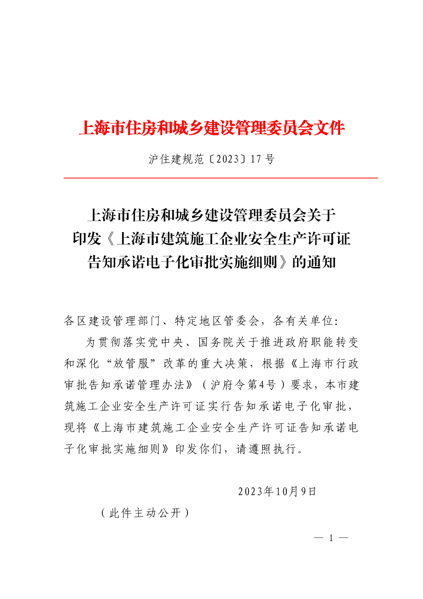 关于印发《上海市建筑施工企业安全生产许可证告知承诺电子化审批实施细则》的通知