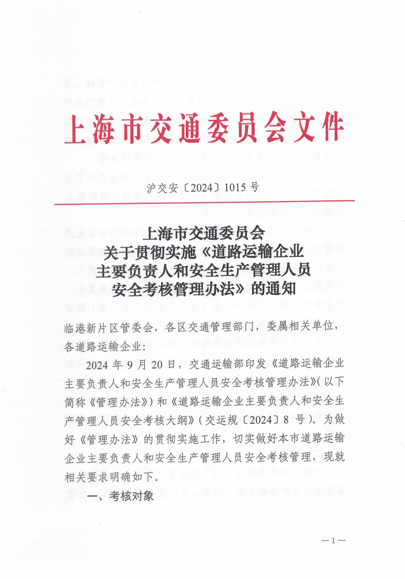 2024年9月20日,交通运输部印发《道路运输企业主要负责人和安全生产管理人员安全考核管理办法》(以下简称《管理办法》)和《道路运输企业主要负责人和安全生产管理人员安全考核大纲》(交运规〔2024〕8号)。为做好《管理办法》的贯彻实施工作,切实做好本市道路运输企业主要负责人和安全生产管理人员安全考核管理,现就相关要求明确如下。