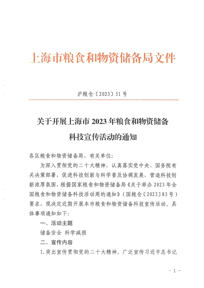 为深入贯彻党的二十大精神,认真落实党中央、国务院有关决策部署,促进科技创新与科学普及协调发展,营造科技创新浓厚氛围,根据国家粮食和物资储备局《关于举办2023年全国粮食和物资储备科技活动周的通知》(国粮仓〔2023〕83号)要求,现决定近期开展本市粮食和物资储备科技宣传活动。具体事项通知如下: