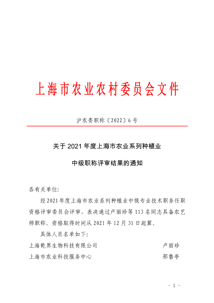 经2021年度上海市农业系列种植业中级专业技术职务任职资格评审委员会评审,表决通过卢丽珍等113名同志具备农艺师职称。资格取得时间从2021年12月31日起算。