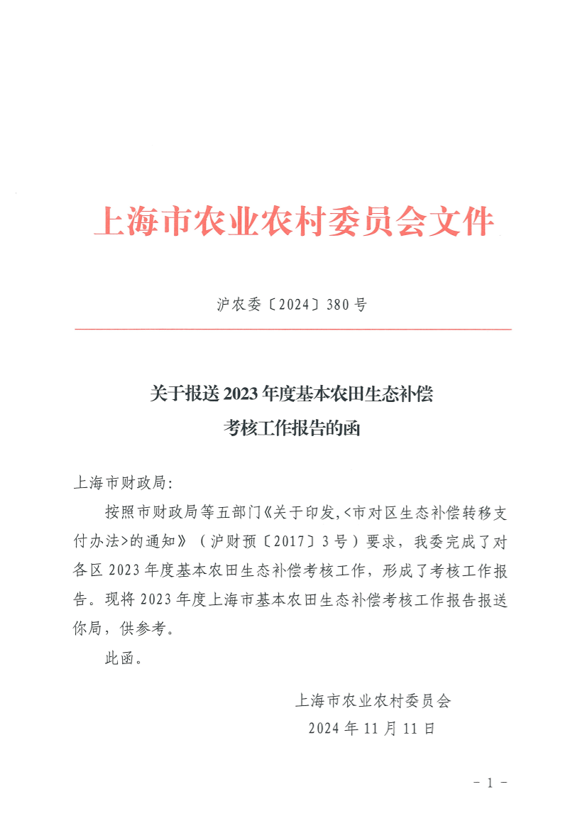 按照市财政局等五部门《关于印发<市对区生态补偿转移支付办法>的通知》(沪财预〔2017〕3号)要求,我委完成了对各区2023年度基本农田生态补偿考核工作,形成了考核工作报告。现将2023年度上海市基本农田生态补偿考核工作报告报送你局,供参考。