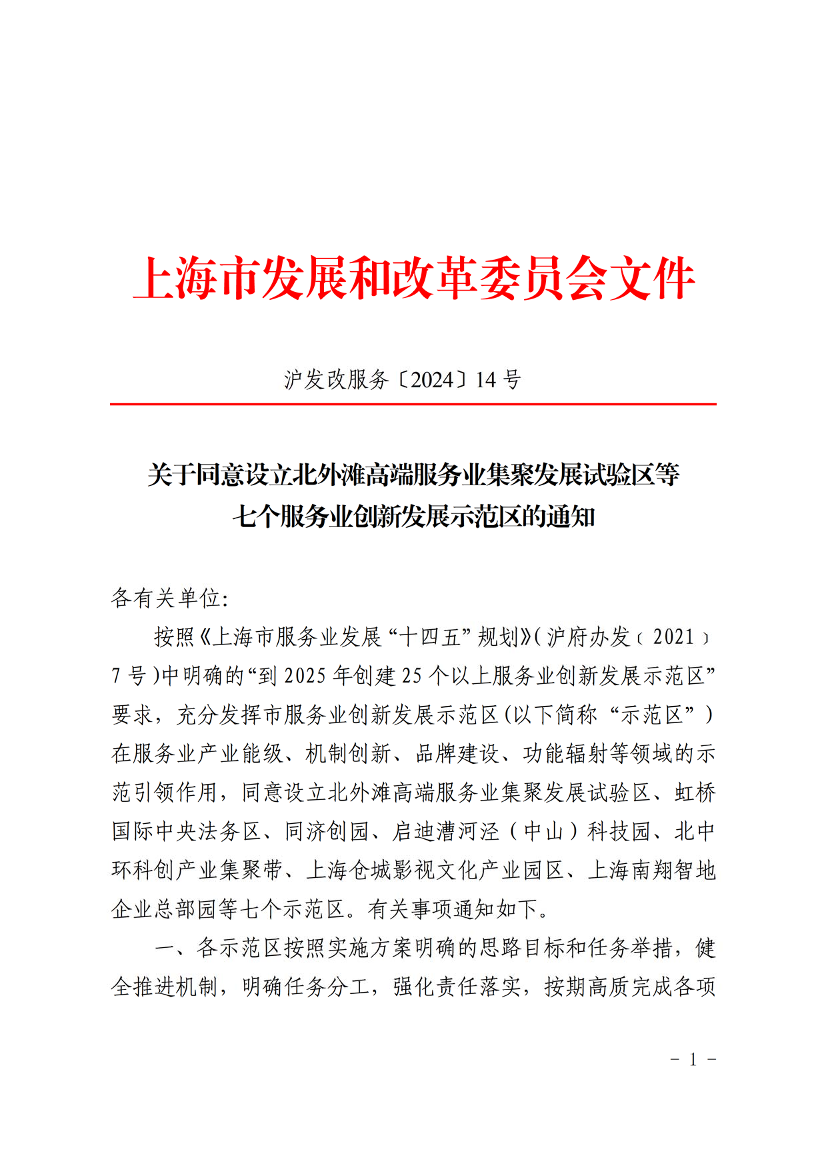 按照《上海市服务业发展“十四五”规划》(沪府办发﹝2021﹞7号)中明确的“到2025年创建25个以上服务业创新发展示范区”要求,充分发挥市服务业创新发展示范区(以下简称“示范区”)在服务业产业能级、机制创新、品牌建设、功能辐射等领域的示范引领作用,同意设立北外滩高端服务业集聚发展试验区、虹桥国际中央法务区、同济创园、启迪漕河泾(中山)科技园、北中环科创产业集聚带、上海仓城影视文化产业园区、上海南翔智地企业总部园等七个示范区。有关事项通知如下。