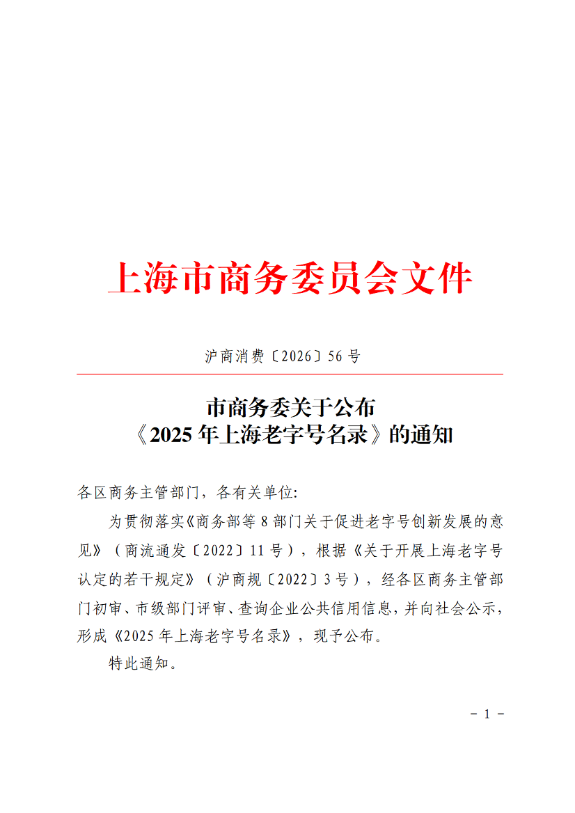 为贯彻落实《商务部等8部门关于促进老字号创新发展的意见》(商流通发〔2022〕11号),根据《关于开展上海老字号认定的若干规定》(沪商规〔2022〕3号),经各区商务主管部门初审、市级部门评审、查询企业公共信用信息,并向社会公示,