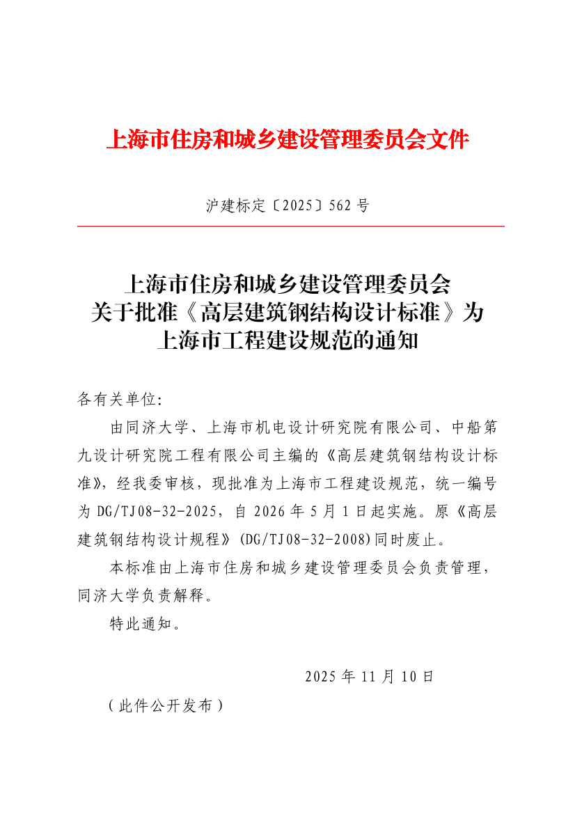 由同济大学、上海市机电设计研究院有限公司、中船第九设计研究院工程有限公司主编的《高层建筑钢结构设计标准》,经我委审核,现批准为上海市工程建设规范,统一编号为DG/TJ08-32-2025,自2026年5月1日起实施。原《高层建筑钢结构设计规程》(DG/TJ08-32-2008)同时废止。