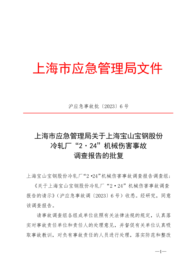 《关于上海宝山宝钢股份冷轧厂“2·24”机械伤害事故调查报告的请示》(沪应急事故调〔2023〕6号)收悉。经研究,同意该调查报告。
