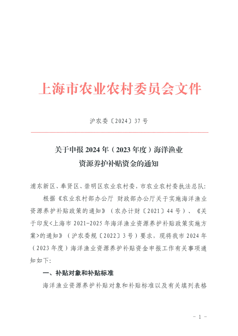 根据《农业农村部办公厅 财政部办公厅关于实施海洋渔业资源养护补贴政策的通知》(农办计财〔2021〕44号)、《关于印发<上海市2021-2025年海洋渔业资源养护补贴政策实施方案>的通知》(沪农委规〔2022〕3号)要求,现将我市2024年(2023年度)海洋渔业资源养护补贴资金申报工作有关事项通知如下:
