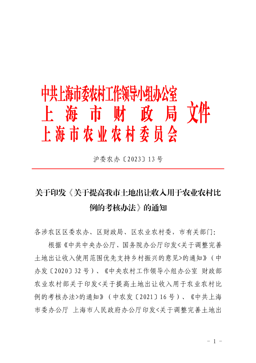 根据《中共中央办公厅、国务院办公厅印发<关于调整完善土地出让收入使用范围优先支持乡村振兴的意见>的通知》(中办发〔2020〕32号)、《中央农村工作领导小组办公室 财政部 农业农村部关于印发<关于提高土地出让收入用于农业农村比例的考核办法>的通知》(中农发〔2021〕16号)、《中共上海市委办公厅 上海市人民政府办公厅印发<关于调整完善土地出让收入使用范围优先支持我市乡村振兴的实施意见>的通知》(沪委办发〔2022〕38号)要求,为确保我市土地出让收入用于农业农村比例稳步达到国家要求,现将《关于提高我市土地出让收入用于农业农村比例的考核办法》印发给你们,请认真贯彻落实。