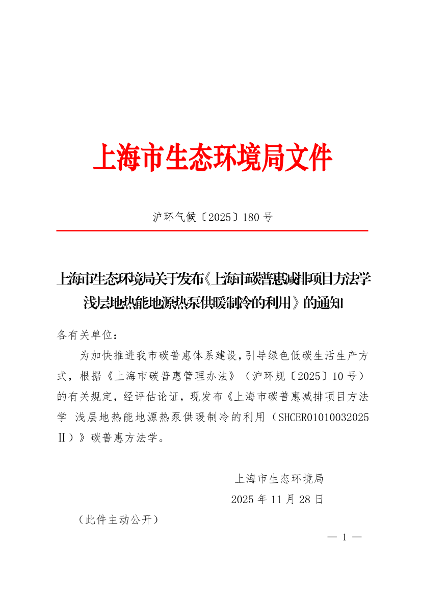 为加快推进我市碳普惠体系建设,引导绿色低碳生活生产方式,根据《上海市碳普惠管理办法》(沪环规〔2025〕10号)的有关规定,经评估论证,现发布《上海市碳普惠减排项目方法学 浅层地热能地源热泵供暖制冷的利用(SHCER01010032025Ⅱ)》碳普惠方法学。