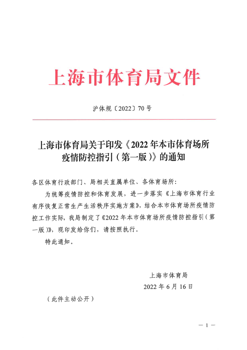 为统筹疫情防控和体育发展,进一步落实《上海市体育行业有序恢复正常生产生活秩序实施方案》,结合本市体育场所疫情防控工作实际,我局制定了《2022年本市体育场所疫情防控指引(第一版)》,现印发给你们,请按照执行。