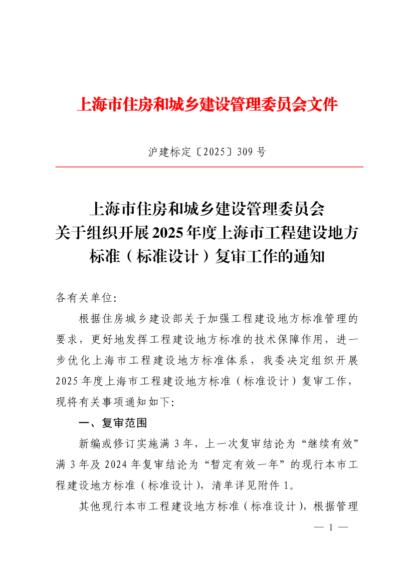根据住房城乡建设部关于加强工程建设地方标准管理的要求,更好地发挥工程建设地方标准的技术保障作用,进一步优化上海市工程建设地方标准体系,我委决定组织开展2025年度上海市工程建设地方标准(标准设计)复审工作,现将有关事项通知如下: