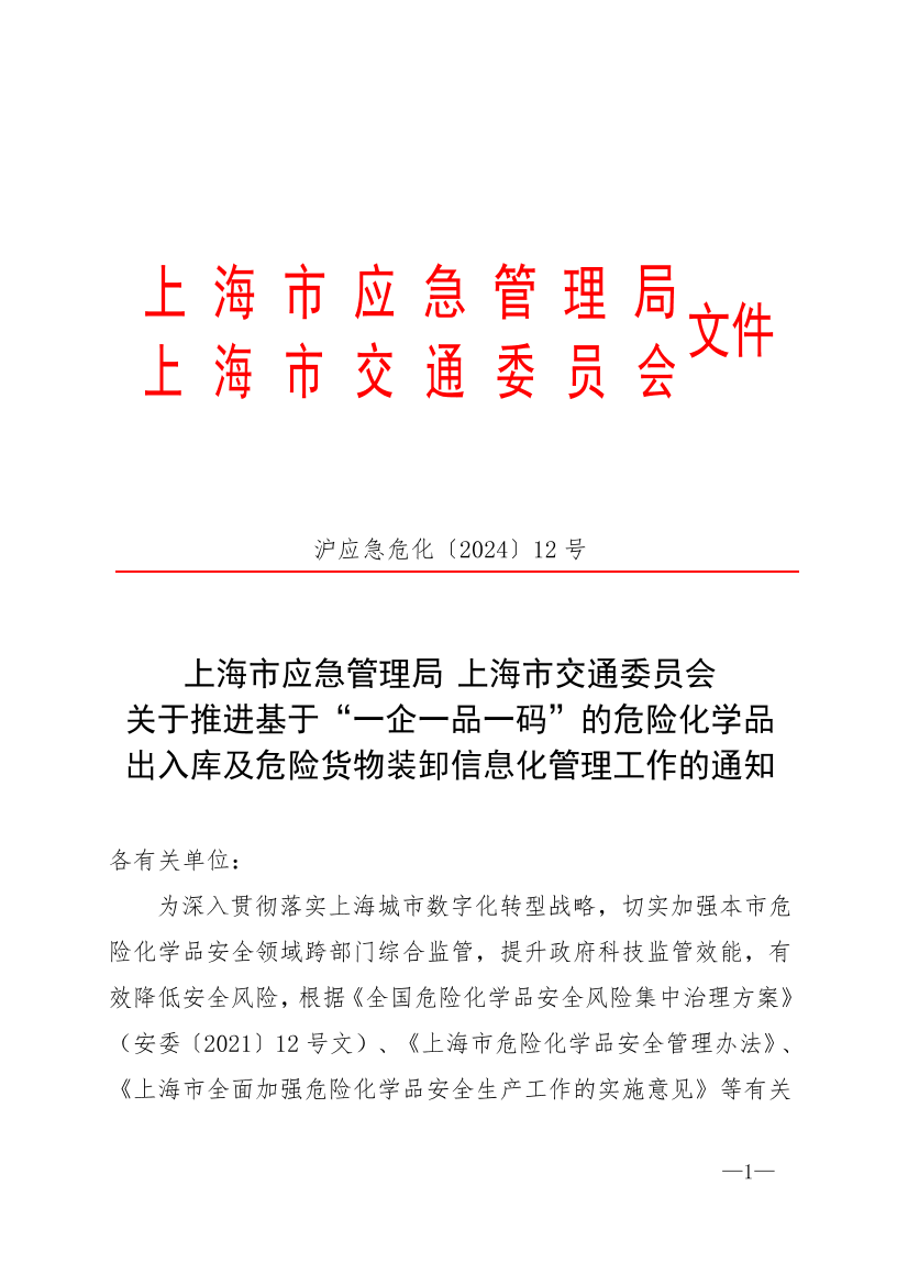 为深入贯彻落实上海城市数字化转型战略,切实加强本市危险化学品安全领域跨部门综合监管,提升政府科技监管效能,有效降低安全风险,根据《全国危险化学品安全风险集中治理方案》(安委〔2021〕12号文)、《上海市危险化学品安全管理办法》、《上海市全面加强危险化学品安全生产工作的实施意见》等有关规定,市应急局、市交通委决定在全市推进以“一企一品一码”为基础的危险化学品出入库及危险货物装卸信息化管理工作,加强各环节的信息及业务衔接。现就有关要求通知如下。