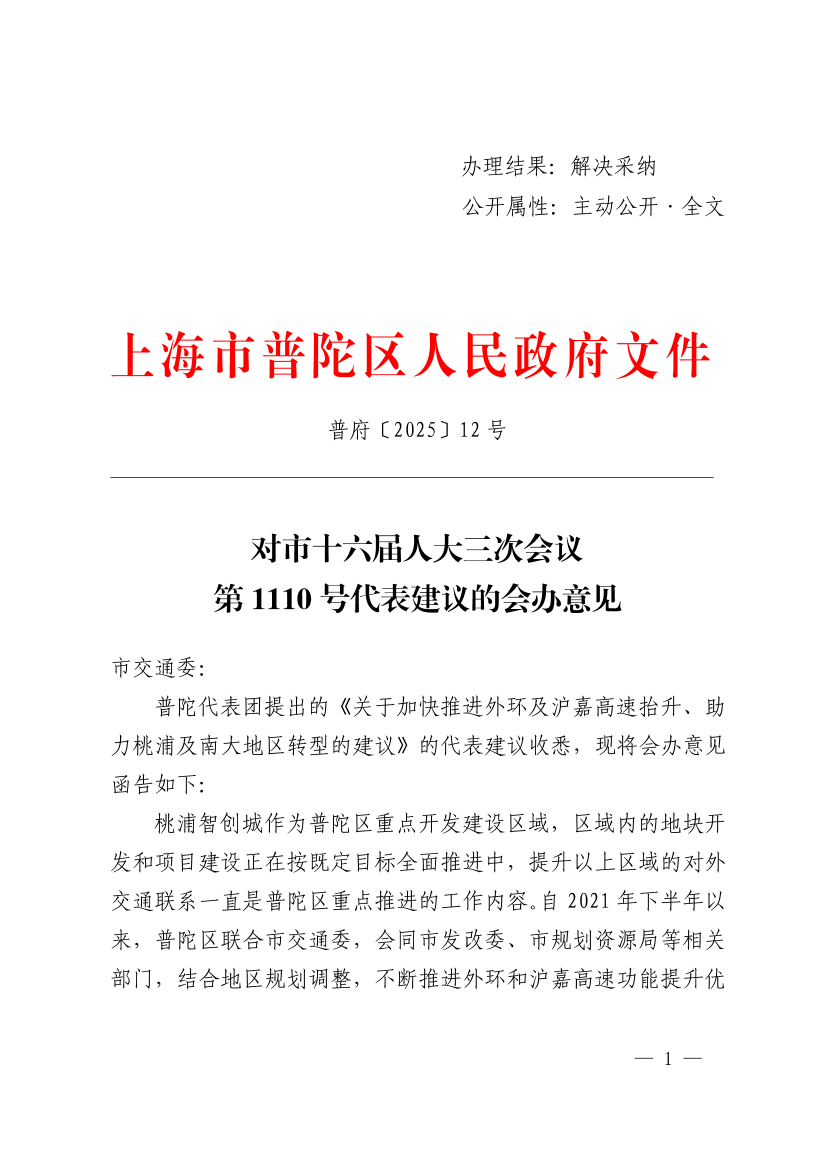 普陀代表团提出的《关于加快推进外环及沪嘉高速抬升、助力桃浦及南大地区转型的建议》的代表建议收悉,现将会办意见函告如下: