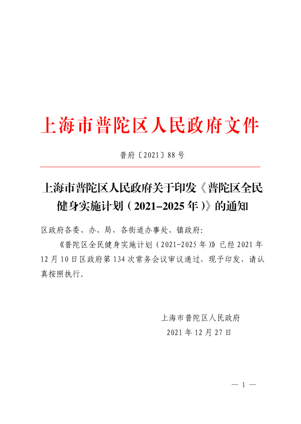 《普陀区全民健身实施计划(2021-2025年)》已经2021年12月10日区政府第134次常务会议审议通过,现予印发,请认真按照执行。