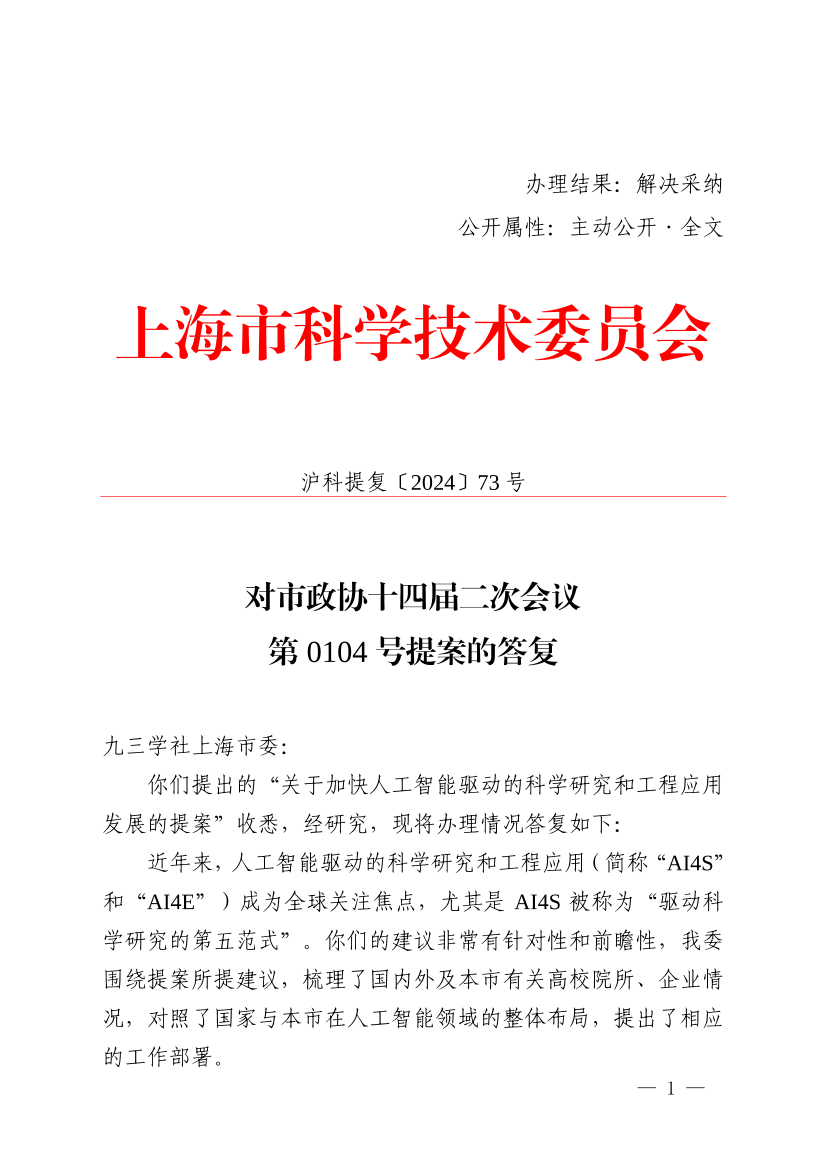 你们提出的“关于加快人工智能驱动的科学研究和工程应用发展的提案”收悉,经研究,现将办理情况答复如下: