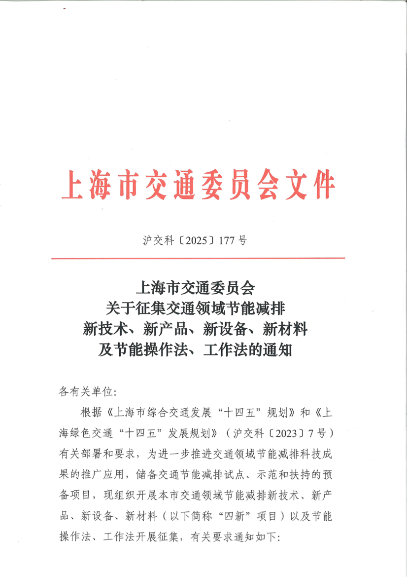 根据《上海市综合交通发展“十四五”规划》和《上海绿色交通“十四五”发展规划》(沪交科〔2023〕7 号)有关部署和要求,为进一步推进交通领域节能减排科技成果的推广应用,储备交通节能减排试点、示范和扶持的预备项目,现组织开展本市交通领域节能减排新技术、新产品、新设备、新材料(以下简称“四新”项目)以及节能操作法、工作法开展征集,有关要求通知如下:
