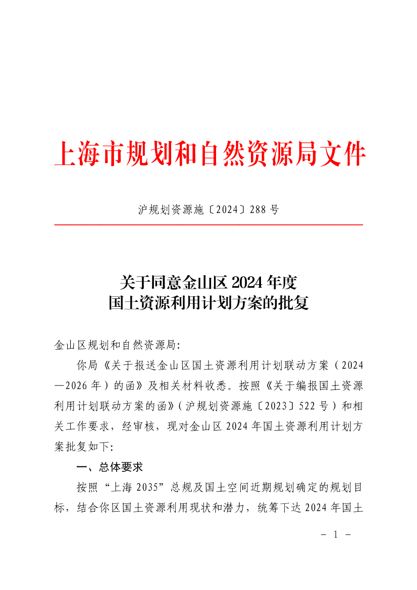 你局《关于报送金山区国土资源利用计划联动方案(2024—2026年)的函》及相关材料收悉。按照《关于编报国土资源利用计划联动方案的函》(沪规划资源施〔2023〕522号)和相关工作要求,经审核,现对金山区2024年国土资源利用计划方案批复如下:
