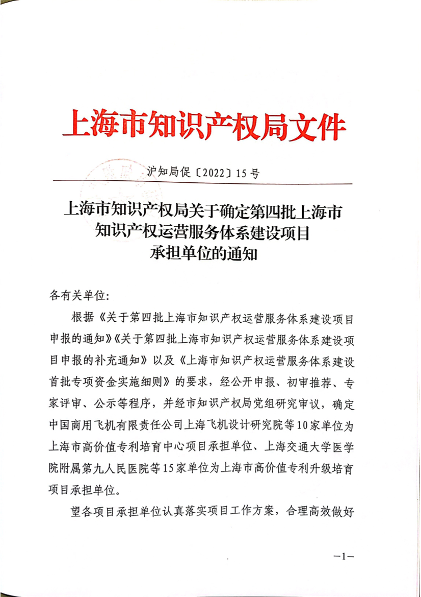 根据《关于第四批上海市知识产权运营服务体系建设项目申报的通知》《关于第四批上海市知识产权运营服务体系建设项目申报的补充通知》以及《上海市知识产权运营服务体系建设首批专项资金实施细则》的要求,经公开申报、初审推荐、专家评审、公示等程序,并经市知识产权局党组研究审议,确定中国商用飞机有限责任公司上海飞机设计研究院等10家单位为上海市高价值专利培育中心项目承担单位、上海交通大学医学院附属第九人民医院等15家单位为上海市高价值专利升级培育项目承担单位。
