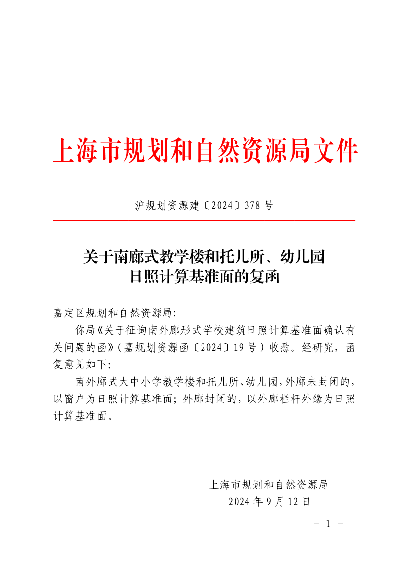 你局《关于征询南外廊形式学校建筑日照计算基准面确认有关问题的函》(嘉规划资源函〔2024〕19号)收悉。经研究,函复意见如下: