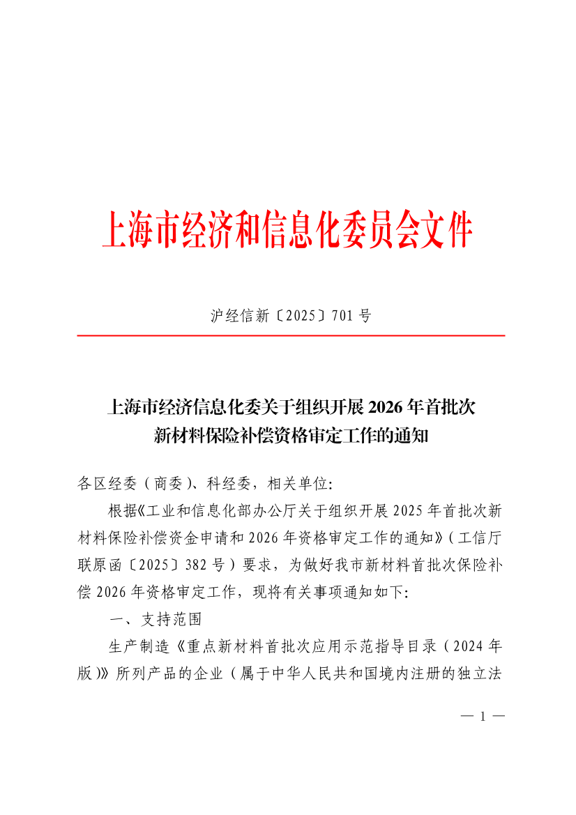 根据《工业和信息化部办公厅关于组织开展2025年首批次新材料保险补偿资金申请和2026年资格审定工作的通知》(工信厅联原函〔2025〕382号)要求,为做好我市新材料首批次保险补偿2026年资格审定工作,现将有关事项通知如下: