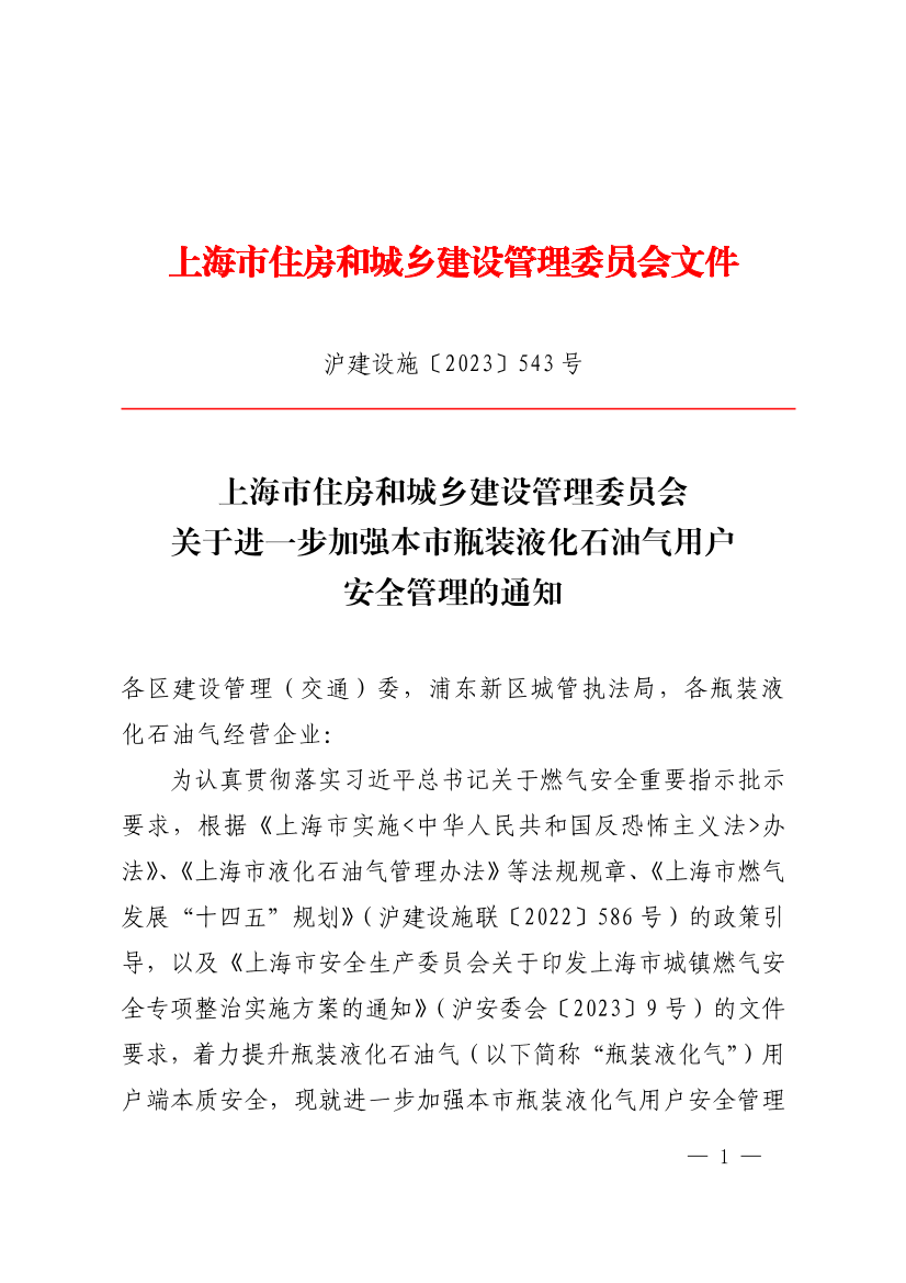 为认真贯彻落实习近平总书记关于燃气安全重要指示批示要求,根据《上海市实施 <中华人民共和国反恐怖主义法 >办法》、《上海市液化石油气管理办法》等法规规章、《上海市燃气发展 “十四五 ”规划》(沪建设施联〔 2022〕586号)的政策引导,以及《上海市安全生产委员会关于印发上海市城镇燃气安全专项整治实施方案的通知》(沪安委会〔 2023〕9号)的文件要求,着力提升瓶装液化石油气(以下简称“瓶装液化气 ”)用户端本质安全,现就进一步加强本市瓶装液化气用户安全管理工作通知如下: