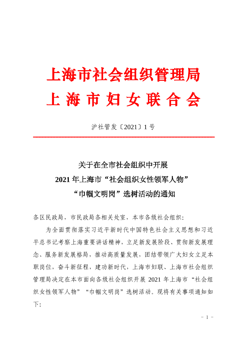 为全面贯彻落实习近平新时代中国特色社会主义思想和习近平总书记考察上海重要讲话精神,立足新发展阶段、贯彻新发展理念、服务新发展格局,推动高质量发展,团结带领广大妇女立足本职岗位,奋斗新征程,建功新时代,上海市妇联、上海市社会组织管理局决定在本市面向各级社会组织开展2021年上海市“社会组织女性领军人物”“巾帼文明岗”选树活动。现将有关事项通知如下: