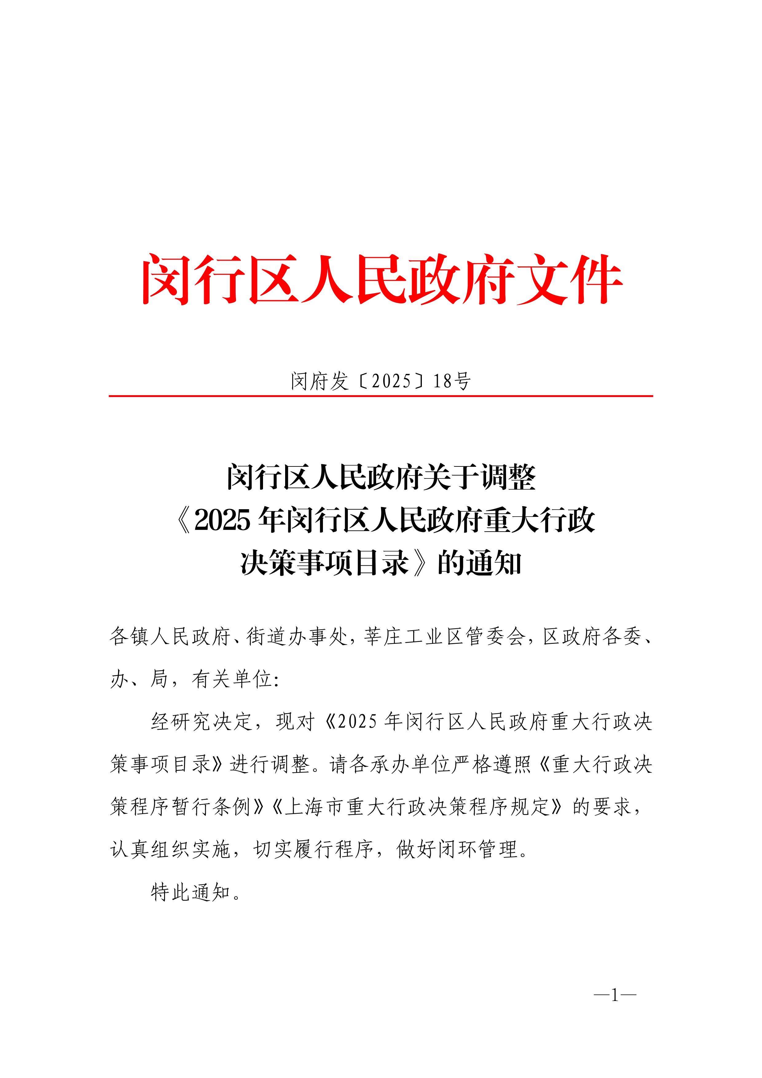 经研究决定,现对《2025年闵行区人民政府重大行政决策事项目录》进行调整。请各承办单位严格遵照《重大行政决策程序暂行条例》《上海市重大行政决策程序规定》的要求,认真组织实施,切实履行程序,做好闭环管理。